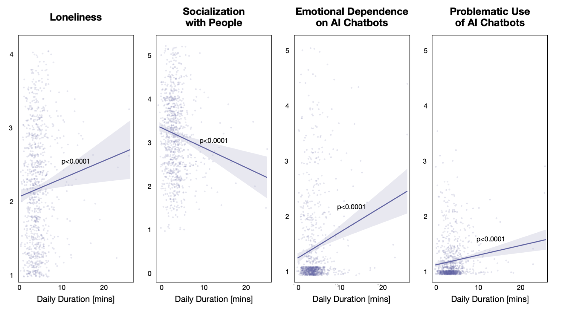 In addition to having negative impacts on critical thinking skills, a joint study from the Massachusetts Institute of Technology (MIT) and OpenAI showed that prolonged use of LLMs correlated with negative psychological outcomes—such as high amounts of loneliness, dependence, and addictive behavior patterns (termed “problematic behaviors” in the study).
